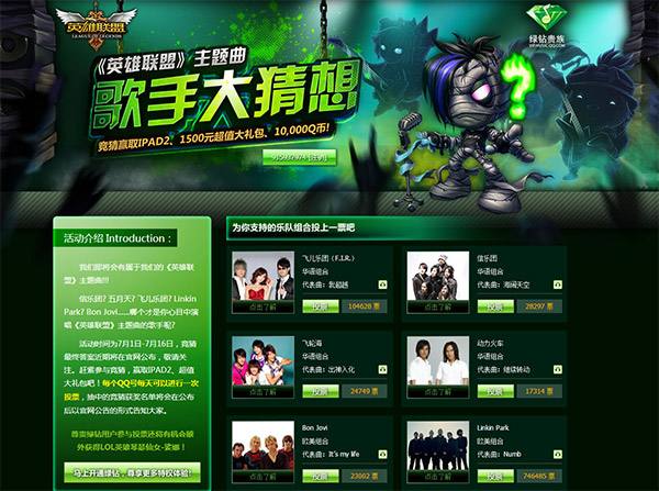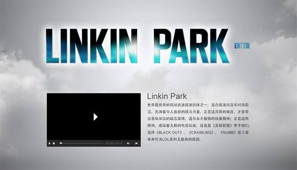 林肯公园当选主题曲乐队后官方为其制作的主题页面,点击乐队名称进入可以欣赏他们的三首英雄联盟主题曲。主题页面风格与林肯公园乐队风格也十分贴近。