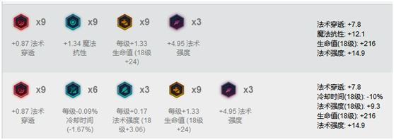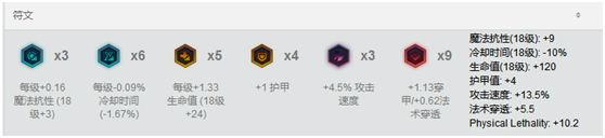 这个符文是当今猪女胜率最高登场率最高的符文配置,魔抗保证猪女后期坦度,冷却让猪女刷野和打团效率提高,再而成长生命值和固定护甲让猪女在前期刷野不会很吃力,其次攻速精华让猪女前期趁技能空挡期间可以更流畅的普攻和在团战中触发三层标记,红色双穿是为了让对面英雄承受更多伤害而配置而成的。