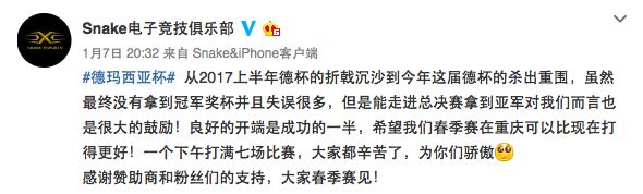 Snake官博:从2017上半年德杯的折戟沉沙到今年这届德杯的杀出重围,虽然最终没有拿到冠军奖杯并且失误很多,但是能走进总决赛拿到亚军对我们而言也是很大的鼓励!良好的开端是成功的一半,希望我们春季赛在重庆可以比现在打得更好!一个下午打满七场比赛,大家都辛苦了,为你们骄傲