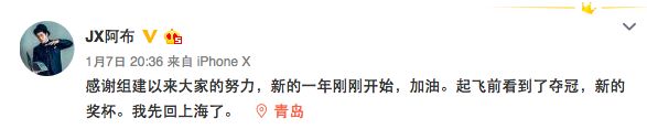 阿布:感谢组建以来大家的努力,新的一年刚刚开始,加油。起飞前看到了夺冠,新的奖杯。我先回上海了。