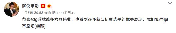 LPL官方解说米勒:恭喜edg成就德杯六冠伟业,也看到很多新队伍新选手的优秀表现,我们15号lpl再见吧