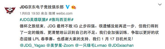 JDG京东电子竞技俱乐部:德杯之旅结束,JDG 最终不敌 IG 止步四强。很遗憾没能再进一步,但我们得到了一定的锻炼,更清楚地认识到自己的不足。我们会加强训练,争取以更好的状态迎接 LPL 春季赛。也感谢大家的支持,我们 1 月 17 日杭州见!