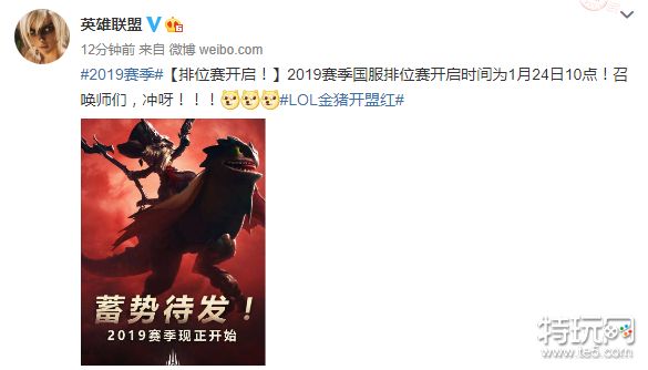 【排位赛开启!】2019赛季国服排位赛开启时间为1月24日10点!召唤师们,冲呀!!!
