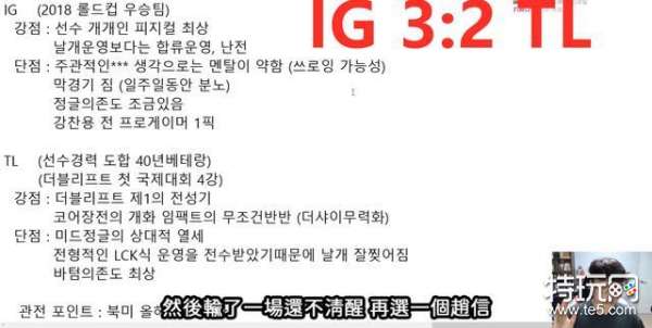 IG和TL的对决,Wolf对于TL不抱任何希望,他给IG的标签是S8冠军队伍,而TL则是选手经验合计超过40年,其中大师兄第一次国际赛四强,当给两支队伍设定标签后后Wolf也是当场笑到窒息,似乎是因为两支队伍的差距太过巨大。
