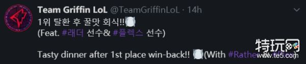 昨日GRF重新回归LCK积分榜榜首,官推也更新了队员们的赛后聚餐合照,其中LNG中单Plex和FW中单Rather均在列: