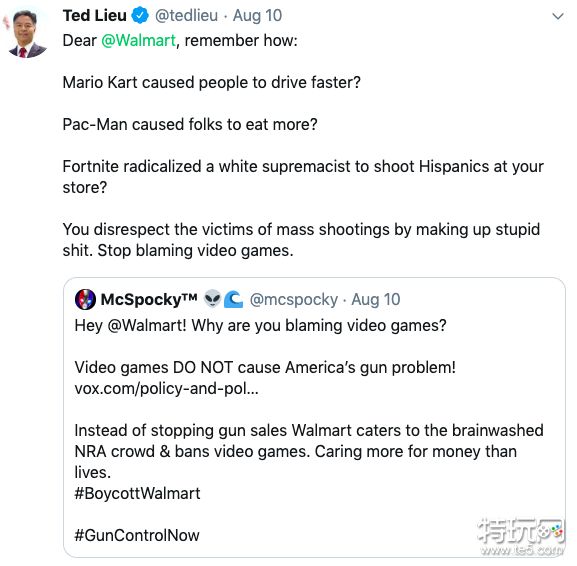 美国著名的影像娱乐机构 McSpocky 在个人推特怒怼沃尔玛将前段时间发生的枪击案事件的起因归罪于电子游戏,枪击案发生后不久,沃尔玛公然拉起横幅:将枪击案时间怪罪于电子游戏的泛滥。