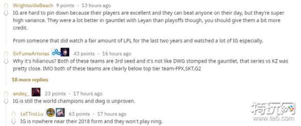 可以看到,iG作为去年的世界冠军,在外网的热度还是非常高的,有些人认为iG依然有着很高的潜力,而有些人认为iG已经不复当年之勇。不知道这份玩家投票的榜单会是毒奶还是预测,让我们在S9的赛场上见真章吧!