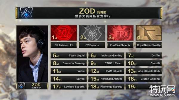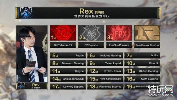 首先是ZOD的世界赛战力预测,他的预测理性来说最为「正常」,将三冠战队SKT放在第一名,第二三名则是G2以及FPX,LMS名次最高的队伍是JT ,但只有第九名,至于ahq跟HKA分别是第十三名及十五名;Rex的前三名预测与ZOD完全相仿,只是JT、ahq排名更为后面,分居第十二名及十四名,至于HKA一样是第十五名。