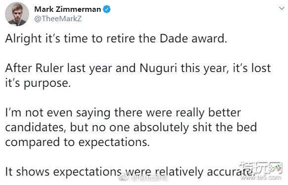 不过就在今年的Dade奖评选出来之后,TL的教练发推建议取消这个Dade奖,因为他觉得这个奖项在去年的Ruler和今年的Nuguri之后就已经失去了它的目的,同时他还提到他不是认为获奖者人选不对,只是觉得与期望相比没有人会绝对不失误,而且期望与失望本身就是相对的。