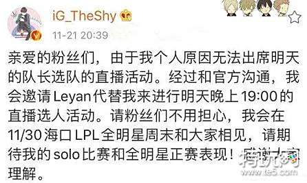 Theshy和Uzi,虽然今年在世界赛上没有能拿到最终的冠军,但是这两人各自位置上还都是目前全球范围内的佼佼者,所以人气都非常高。Uzi作为队长,明天直播选人已经确定。但是Theshy却因为个人问题,在今天晚上宣布将会缺席明天的直播选队的活动。经过和官方沟通后,Theshy表示将让Leyan代替自己进行直播选人,而自己将肯定会参加月底的全明星赛。