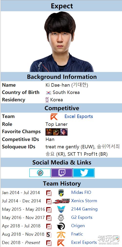 Expect选手为LEC赛区的韩援上单选手,曾效力于G2,FNC等队伍,在2019LEC夏季赛中出场15次,KDA为1.7,参团率达到62.8%,擅长英雄为纳尔,兰博等