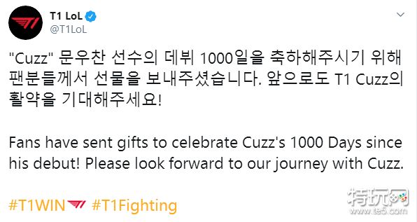 今天,T1官推更新了为Cuzz庆祝出道1000天的图片,并配文: