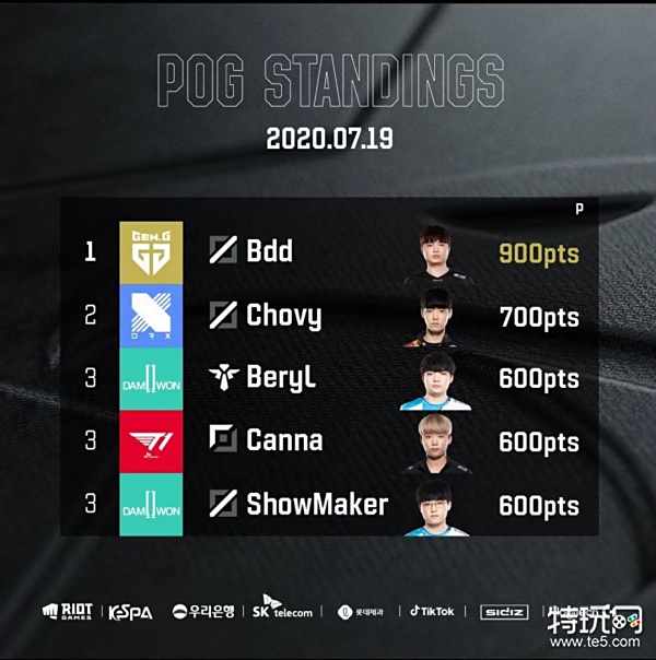 LCK发布目前POG积分榜,Bdd以900点高居榜首,Chovy以700点位居次席,BeryL、Canna、ShowMaker以600点并列第三名。
