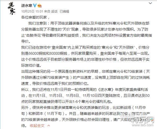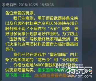 部分区寒光令一度涨到30万+,天外陨铁涨到25万+,这个价格就连土豪也有些难以承受,所以策划再次出手,直接在皇宋宝库中上架寒光令和天外陨铁,价格分别是86000铜钱和80000铜钱,供玩家限量购买,这也导致了全服的寒光令和天外陨铁价格随之下跌,很多高价囤货的商人叫苦不迭,纷纷表示要上天台了。