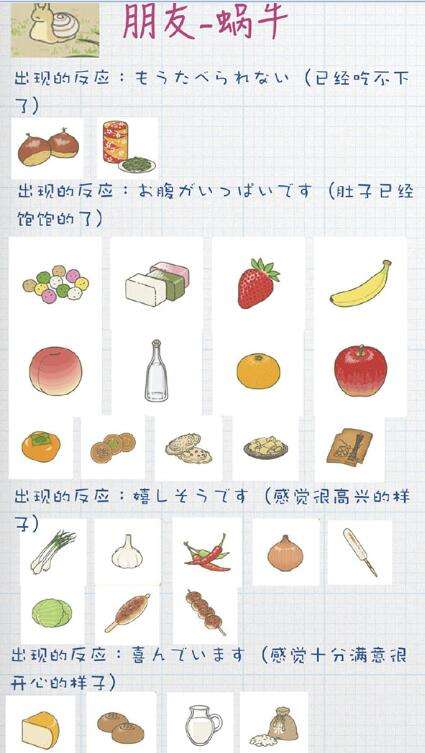 随便选择一个食物,就可以喂饱蜗牛了。如果玩家选择的食物正好是蜗牛爱吃的,那么界面上出现“喜”或“嬉”之类的字眼。