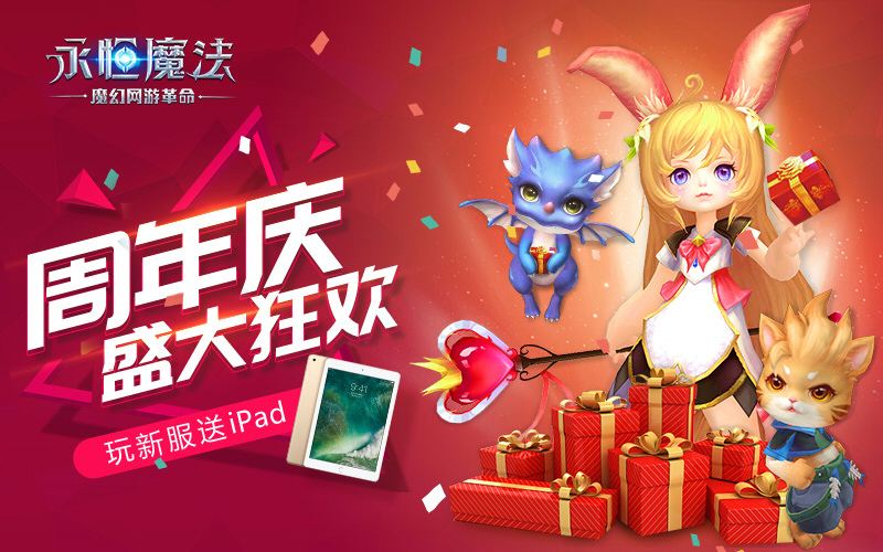 一周年福利大放送,《永恒魔法》周年庆典给玩家准备八大活动,参与活动人人有礼:新服副本通过赢iPad、10000元现金红包;公会争霸赛竞争最强公会,共现金红包及稀有游戏道具共计10000元;此外,玩家每日登录、组队参与任务、回顾并分享自己“游戏人生”等活动更有丰厚大礼,京东购物卡、丘比兔抱枕、游戏大礼包领不停!