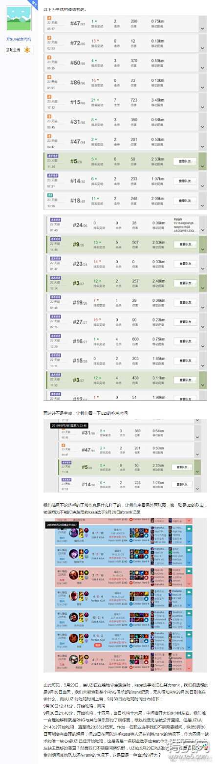 近日有网友爆料称,Uzi在RNG抵达韩国集训之初沉迷吃鸡,9月29日及9月30日两天连打了31局绝地求生;而这两天Uzi仅进行了3局Rank训练。我们查证后发现,10月小组赛开始后Uzi的吃鸡账号就不再有游戏记录了,Rank训练量也恢复了正常,希望大家理性看待。