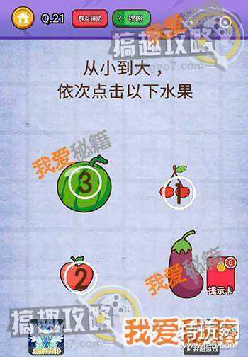 《燃烧吧我的大脑》游戏第21-25关的问题分别是:从小到大,依次点击以下水果、上帝之手帮助你到达终点、把瓶子放在原位、求解sinx/n=?、老王不开心了 想办法让他高兴起来。下面小编给大家一一分享答案。