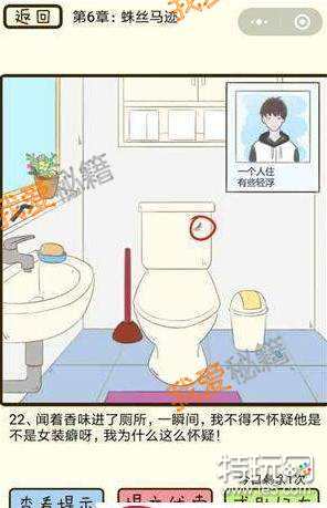 《疯狂女神探》第六章是——“蛛丝马迹”,这款游戏的背景故事是一对小情侣,男人扮演的角色是出轨,而女人是找线索,下面我爱秘籍小编给大家分享一下攻略。