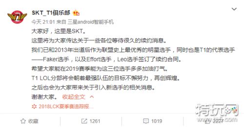 SKT俱乐部官宣和Faker已经续约,微博原文如下: