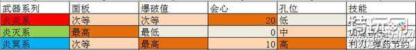 炎炎系的武器在三个分支中,面板次等,爆破值居第二,会心20,孔位最差,附带技能“毅力”,效果是 体力在一定程度以上时,一条命一次,可以承受一次必杀攻击并留一滴血。