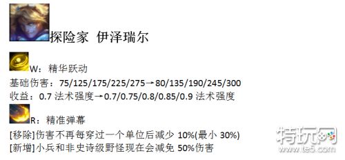 解析:之前设计师提到了会增强APEZ这个玩法的强度,所以他们就对W技能的伤害以及AP加成进行了提升,提升幅度还相当的大,这应该会让双修EZ以及APEZ变得更加强大。而R技能的清兵能力也被大幅度削弱,以前是最低伤害为30%,现在是对小兵和非史诗级野怪只造成50%的伤害,这个削弱还是比较明显的。