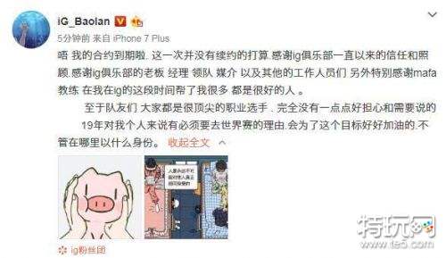 唔 我的合约到期啦. 这一次并没有续约的打算.感谢ig俱乐部一直以来的信任和照顾.感谢ig俱乐部的老板 经理 领队 媒介 以及其他的工作人员们 另外特别感谢mafa教练 在我在ig的这段时间帮了我很多 都是很好的人 。