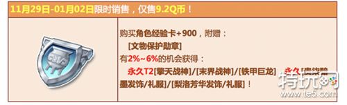活动详情:11月29日-1月2日,在飞车商城购买【角色经验卡+900】,赠送【文物保护勋章】,有机会得永久T2【擎天战神】/【末界战神】/【铁甲巨龙】、永久【贵柒黯墨发饰/礼服】/【梨洛芳华发饰/礼服】或其他奖励之一!其中核心极品期限型概率范围为:4%-6%,核心奖励永久型概率范围为:2%-4%,非核心奖励概率范围为:90%-94%。