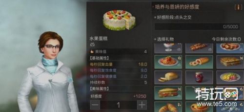 不过恩研的喜欢水果蛋糕,目前测试这个食物可提升1250好感度,食物有等级之分,越高级的食物增加好感度越高!