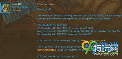 炉石传说社区经理发布蓝帖,公开炉石传说拉斯塔哈的大乱斗新版本更新具体时间。现在预购拉斯塔哈的大乱斗卡包,还可获得额外奖励。