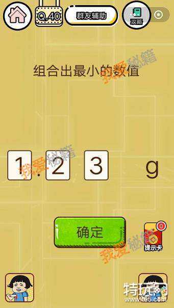 智力达人第40关图片中有几个数字,就是123,然后要求我们组合出最小的数字,玩过最坑游戏的玩家们比较清楚,题目后面黑点一定是坑,所以答案是1.23,为什么输入之后不对呢?赶紧来看正确答案吧!