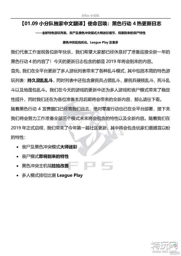 今天的更新日志包含的都是2019年将会到来的内容:全新特色游玩列表、丧尸及黑色冲突模式大师迷彩细节、将要到来的丧尸特性