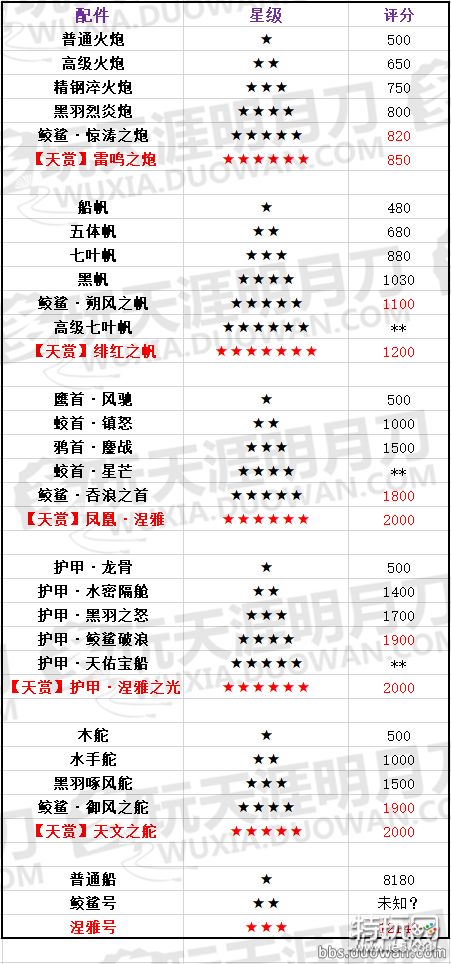 1.本表列出所有天刀航海船只的配件,但有部分暂未开放制造及使用功能所以暂无评分显示为**。