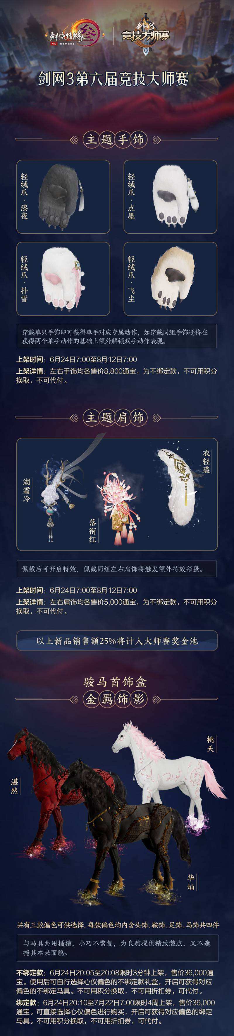 不仅如此,为迎接第六届大师赛的到来,《剑网3》更有靓丽新品登场增添更多趣味,全新手饰“轻绒爪”系列、大师赛主题肩饰“落衔红”、“衣轻裘”、“湖霜冷”以及全新骏马首饰盒“金羁饰影”系列可谓令人眼前一亮!新品亮相引江湖惊叹,就请跟随资讯君的脚步,一起来了解更多细节吧!