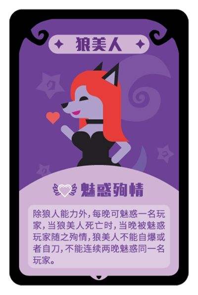 狼美人是狼人阵营中一个非常特殊的角色,它具备魅惑技能,当狼美人被出局后,可以带走被魅惑的玩家。狼美人通常需要找到重要的神职角色来魅惑,比如女巫、守卫等等,一旦狼美人可以通过技能带走女巫和守卫,狼人就会有很大的优势,离胜利也不远了。