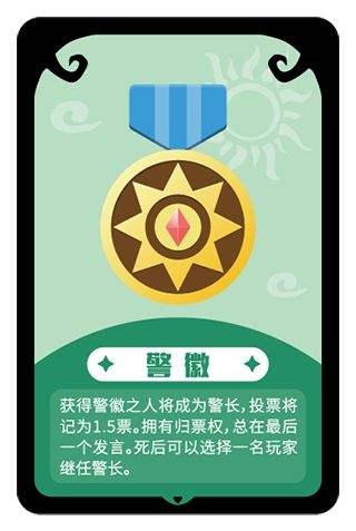 警长不是角色!警长不是角色!警长不是角色!警长只是一个身份象征,任意一个角色在游戏中都可以成为警长,最常见的警长就是预言家和悍跳狼,警长具备1.5票的归票权,也具备归票权和决定发言顺序的权利。当预言家拿到警长的时候,可以打出警徽流,让自己的查验可以多报出来一轮。