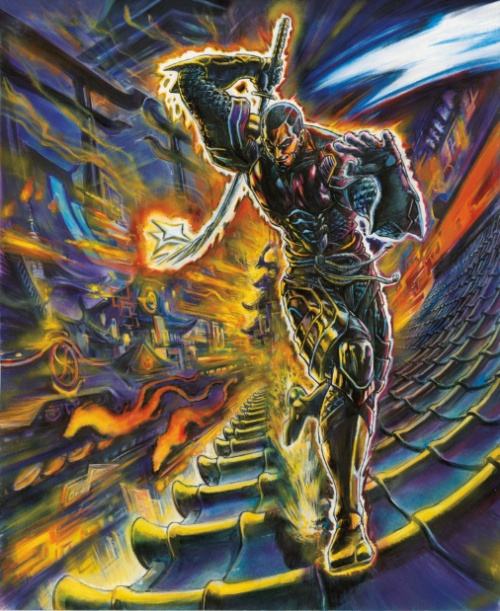我很喜欢弗兰克·法拉捷特的画,他削减的手法给了我很大参考。大约在20年前,我也受到了亚历克斯·罗斯的人物的涂抹方法和光的表现等影响。在这次的插画里,科幻忍者的世界观如同灯饰一样的光的画法也采用了不少他的技巧。