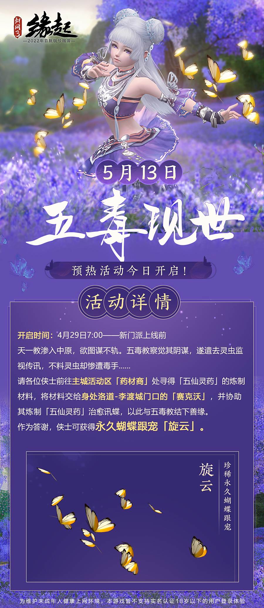 4月29日7:00-5月13日7:00,侠士可前往主城活动区寻找【药材商】接取每日委托,配送药材给洛道-李渡城外的【赛克沃】,助其调制【五仙灵药】,医治受天一教蛊术之害的灵宠讯蝶,即可获赠永久绚美蝴蝶灵宠【旋云】!