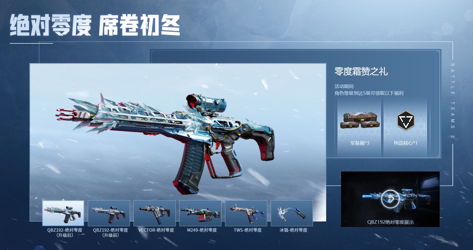 全新军备池急冻狂潮来袭,不朽品质武器「QBZ192-绝对零度」震撼首发!武器以炸裂冰晶为设计理念,枪身处的根根冰柱仿若自带冷气,弹匣内放置着半透明的冰晶弹药,把致命寒意输送给每位敌人。军备池在架期间,玩家角色达到相应等级可免费领取军备箱与构造核心奖励。此外显露猎杀本色的幽暗狼系列、唤醒凛冬意志的冰冻都市系列武器也将同步上线,为新赛季添上靓丽色彩。