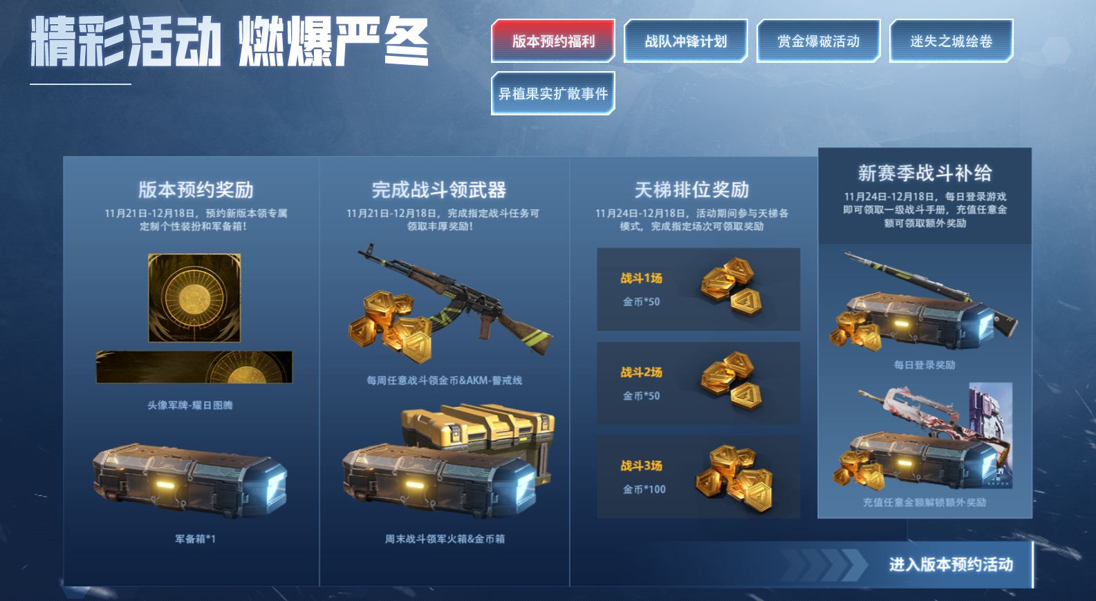 全新活动迭代上线,海量福利惊喜放送!预约新版本获得专属定制个性装扮和军备箱;版本更新后完成指定战斗任务能领取金币、武器、军备箱等丰厚补给;活动期间任意对战均会掉落异植果实,积攒足够的果实数量可前往仓库兑换游戏货币、军备箱、构造核心等奖励。此外完成赏金爆破模式对局、地图碎片收集也可获得随机金币与额外福利。初冬版本将启,冰晶席卷全新赛季!即刻前往官网(www.ssjj.cn)下载体验~