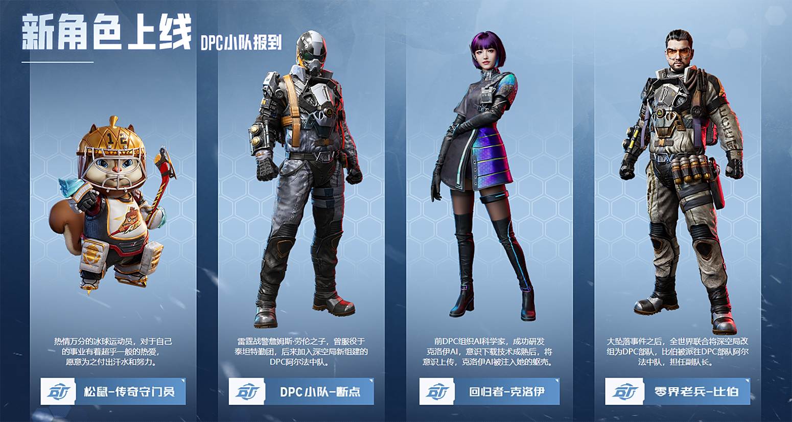 全新组织DPC小队登场,成员断点、老兵比伯与前小队AI科学家克洛伊前来报道!大坠落事件后,全世界联合改组成立DPC小队以有序管理、合理开发并利用星尘物质。AI角色克洛伊的外观造型与她的身份有着同样的科幻感,炫酷紫发搭配霓虹色泽皮质短裙,颇具赛博朋克气息;两位男角色则全副武装,时刻严正以待迎接战斗的到来。另有大头角色松鼠加入,展现传奇守门员的英姿。