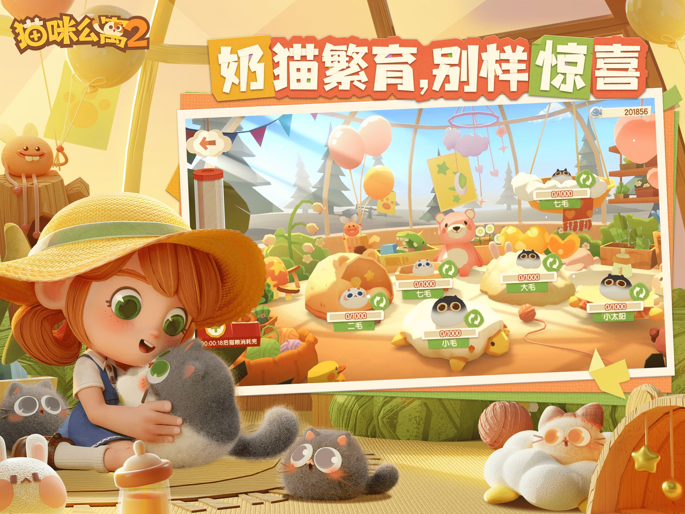 《猫咪公寓2》还有特色的奶猫繁育玩法,玩家可以选择两只不同性别的猫咪,在好感度到一定程度之后,就可以繁殖下一代小猫。也可和好友共同培育二代小猫!小猫的外貌、属性和稀有度都是随机的,还有机会培育出特殊的变异小猫咪,打造你的专属小可爱!