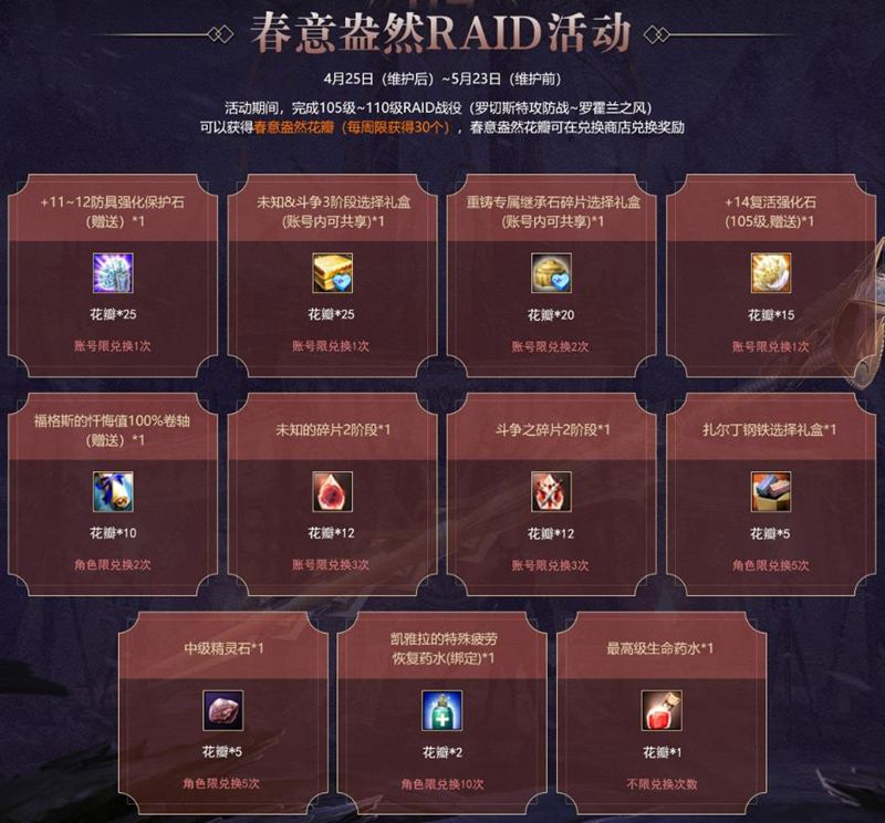 同时,在活动期间参与“春意盎然RAID活动”,英雄们完成105级至110级RAID战役,可获得“春意盎然花瓣”(每周限获得30个),花瓣可在兑换商店中兑换扎尔丁钢铁等奖励。