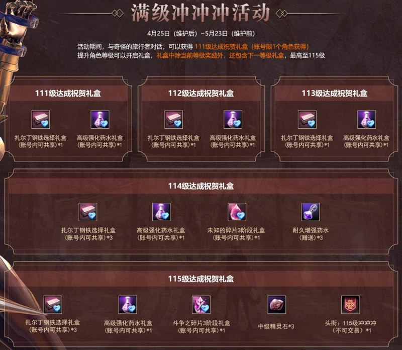 在115级开启的同时,满级冲冲冲活动也将开启,在活动期间与奇怪的旅行者对话,可获得111级达成祝贺礼盒,提升角色等级后可开启礼盒,礼盒中除了当前等级奖励外,还包含下一等级礼盒,直至开启115级礼盒为止。