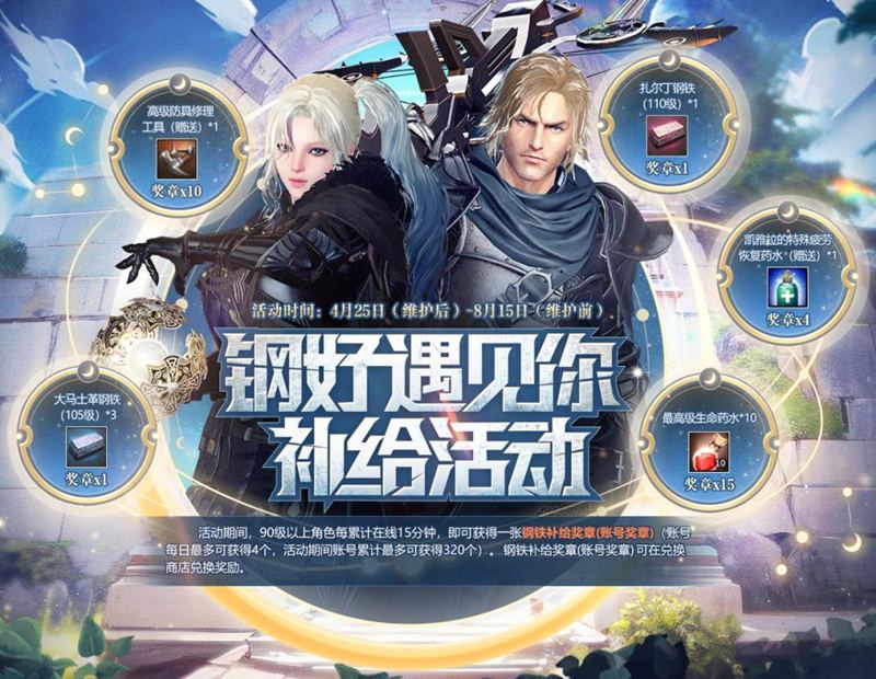 “钢”好遇见你补给活动也将开启,在活动期间,90级以上每累计在线15分钟,即可获得一张钢铁补给奖章(账号奖章)(账号每日最多可获得4个,活动期间账号累计最多可获得320个),奖章可在兑换商店中兑换110级扎尔丁钢铁、105级大马士革钢铁等实用道具。