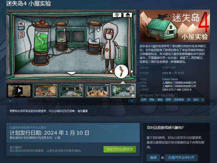 《迷失岛4小屋实验》是迷失岛系列的最新作品,现已在蒸汽平台上线。游戏延续了该系列的鲜明胖布丁手绘风格和传统的点击解谜玩法,同时加入了更多新的元素和挑战。本作中大量信息都隐藏在NPC的对话中,玩家需要仔细聆听每一句对话,不要漏掉任何线索。此外,游戏还保留了二周目模式,让玩家可以在第二次游戏中更进一步理解游戏的剧情和玩法。目前,游戏正在进行首周9折特惠活动,折扣价为16.2元。对于喜欢解谜游戏的玩家来说,这是一款值得尝试的作品。