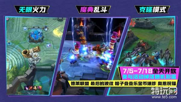 7月5日0点至7月18日23:59分,无限火力、克隆模式、魔典乱斗三大娱乐模式开放,随机彩蛋惊喜来袭!德莱联盟、最后的波纹、帽子叠叠乐、金币爆炸和奥恩祝福都会加入随机彩蛋池,召唤师们更期待哪个呢?
