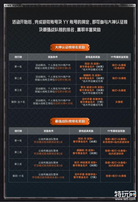 除了丰富的用户福利活动,YY 语音还携手穿越火线为高级别玩家策划了专属福利活动,2025年4月起,双方将面向所有绑定YY语音和游戏账号的用户,推出“大神认证排行榜”及“最强公会排行榜”月榜活动,一旦上榜将获得限定版游戏皮肤+名片奖励,及诸多YY语音专属权益奖励,彰显身份的尊贵。值得一提的是,这是穿越火线首次推出战队排行类活动,谁能拿下首次奖励,将载入游戏史册。