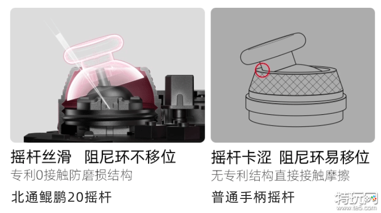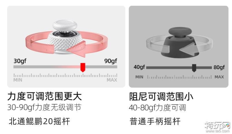 可调摇杆松紧阻尼环,轻轻一扭游玩更顺手 北通鲲鹏20绝尘白在原来丝滑先进“TMR摇杆”的基础上,新增可以随时调节摇杆松紧的阻尼环。且对比同级手柄,北通鲲鹏20绝尘白力度可调范围更大。