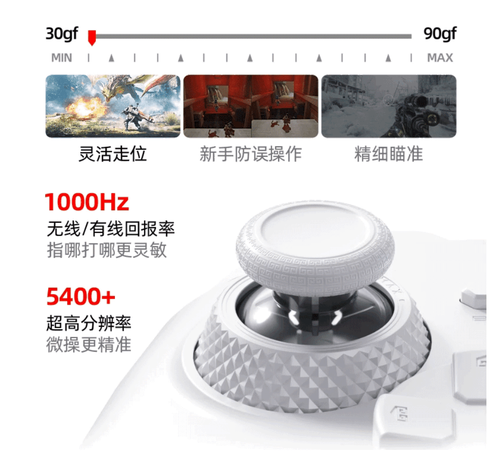 向左调松,玩频繁需要转动视角的游戏,松快的摇杆能让操作更迅捷省力。 向右调紧,玩射击游戏细微微调,手指不发抖、准星不乱飘,一枪爆头几率大大提高。